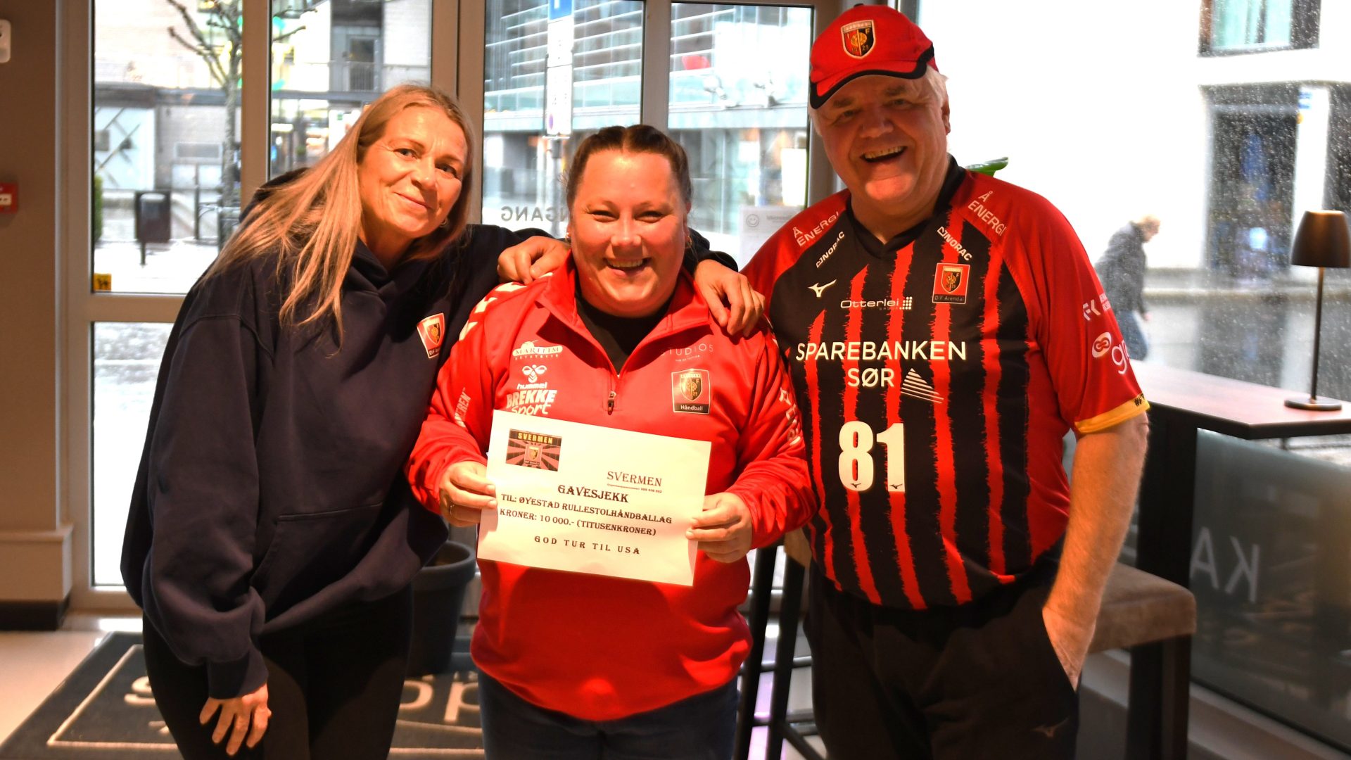 På vei hjem fra Sandefjord tirsdag kveld hadde Svermen sitt tradisjonelle loddsalg på bussen – men denne gangen med en ekstra viktig bakgrunn. Hele inntekten fra loddsalget ble nemlig gitt til Øyestad Rullestolhåndball, som har blitt invitert på turnering i USA.